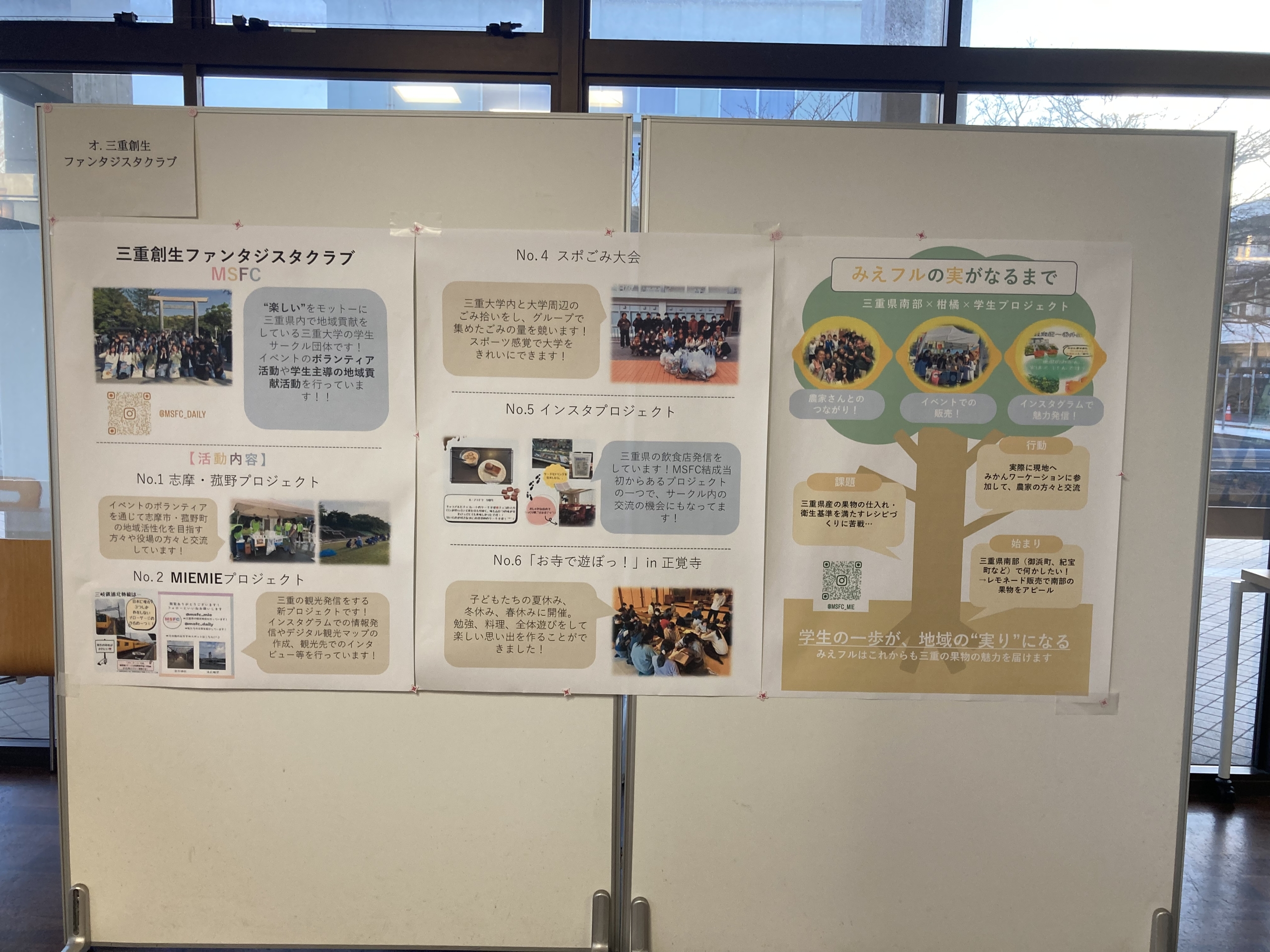 2026年2月26日(木)鈴鹿工業高等専門学校にて「みえまちキャンパスin鈴鹿高専」を開催しました。今年度は12団体と参考発表1団体の計13団体の学生たちが参加し、プレゼンテーションとパネル展示による発表を行いました。また、参加校の学生による意見交換会・交流会も行い、親睦を深めました。
